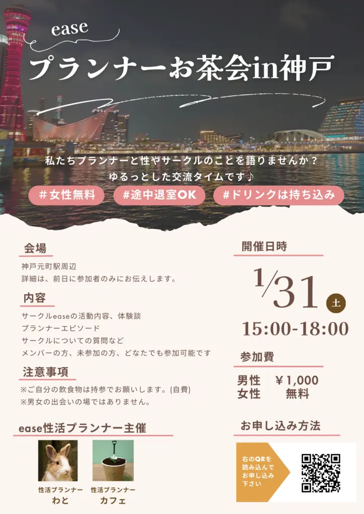 セックスサークルeaseの「プランナーお茶会in神戸」が1/31 神戸元町駅近くで開催決定